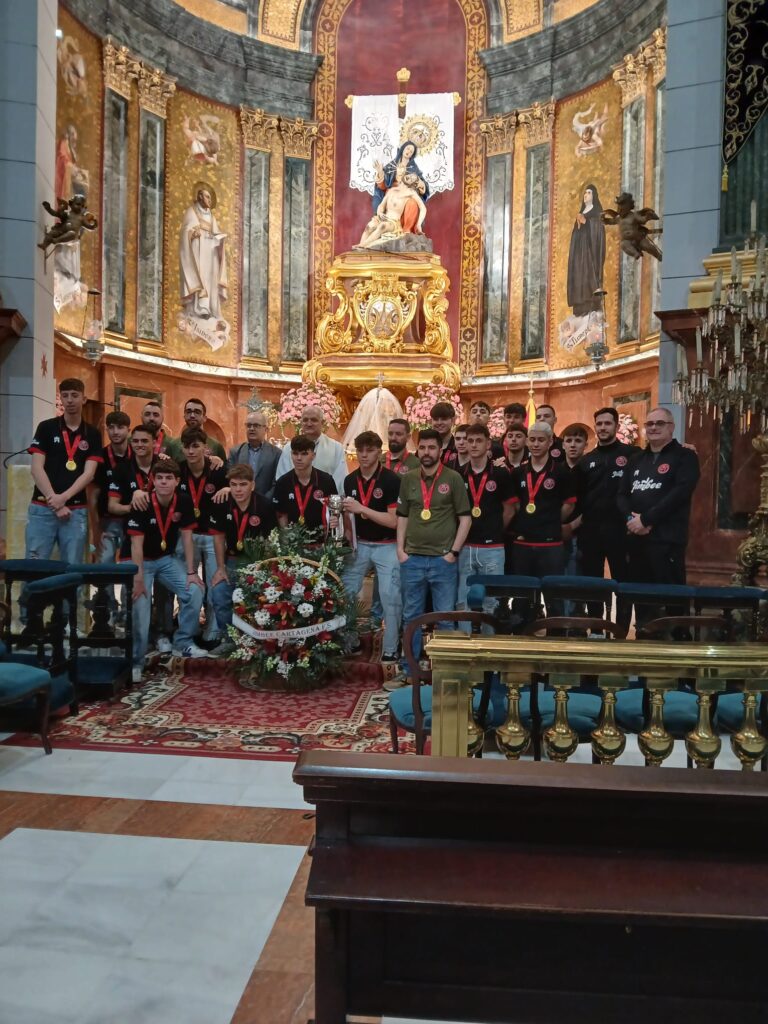 Los juveniles del Jimbee realizan una ofrenda floral a la Patrona por su triunfo en la Copa de España.